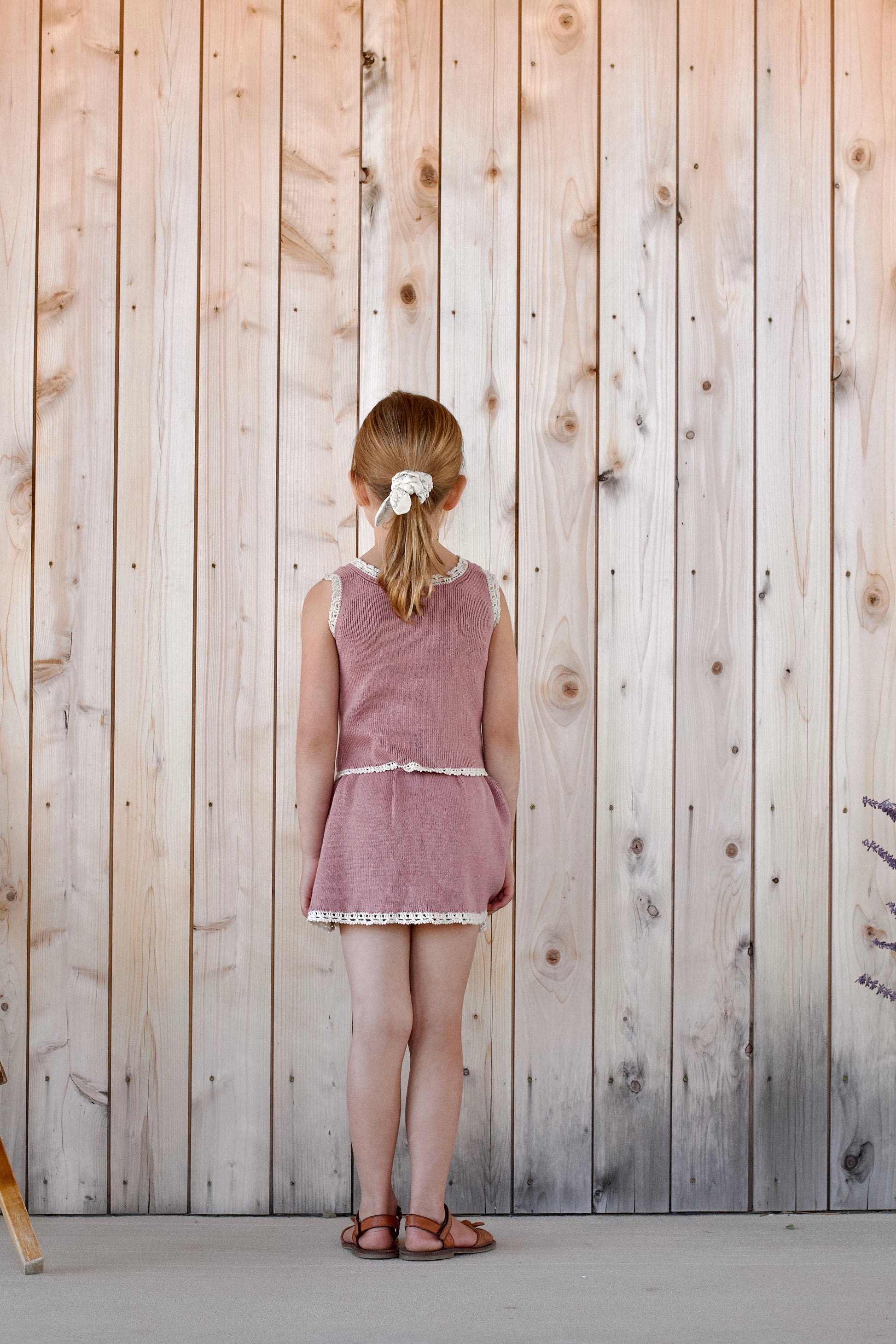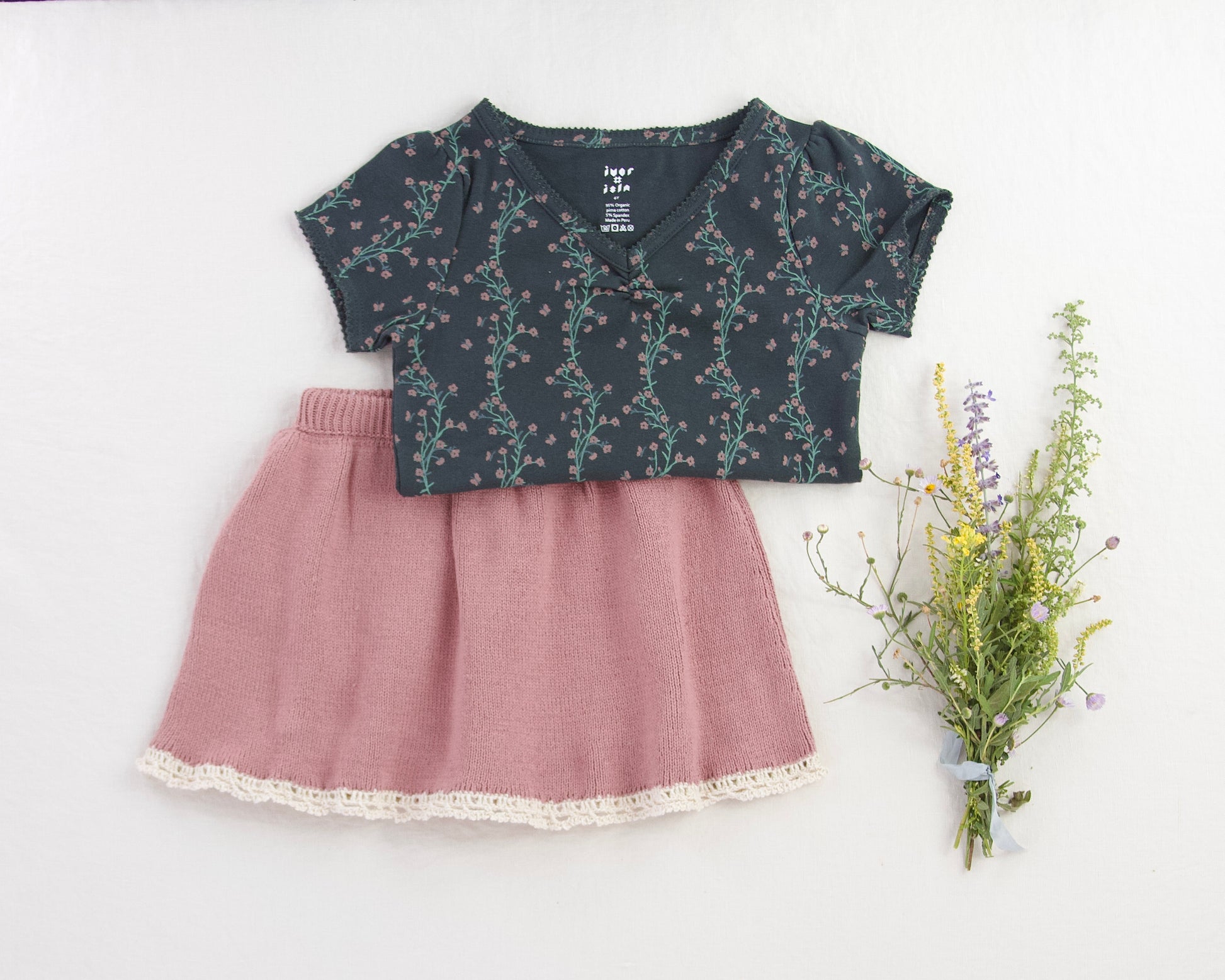 a ribbed-knit skirted bloomer with lace crochet edge detailing . hidden elastic waistband .