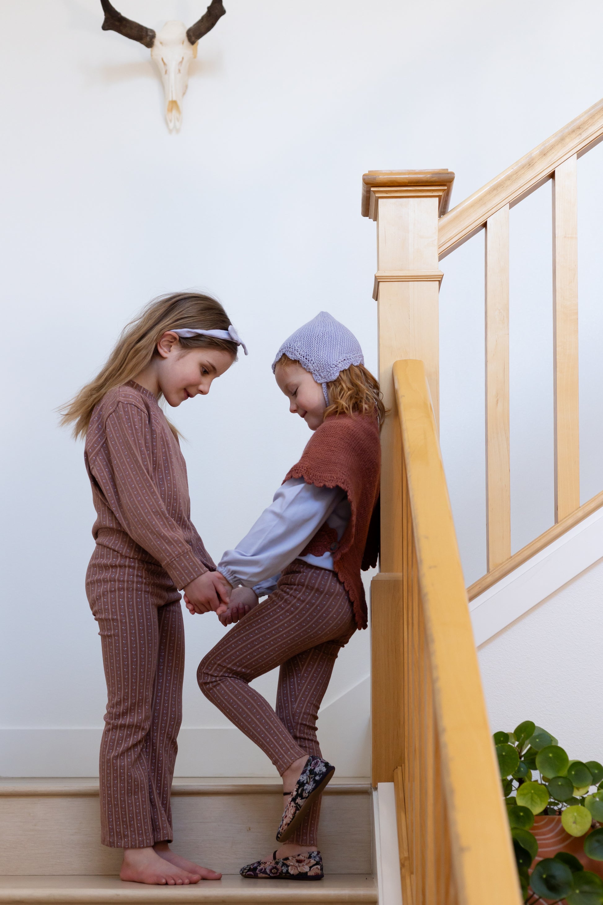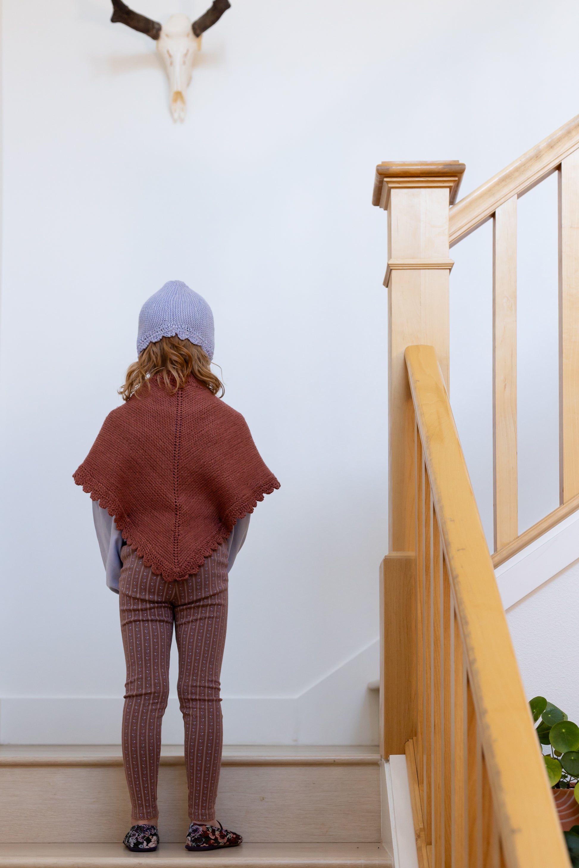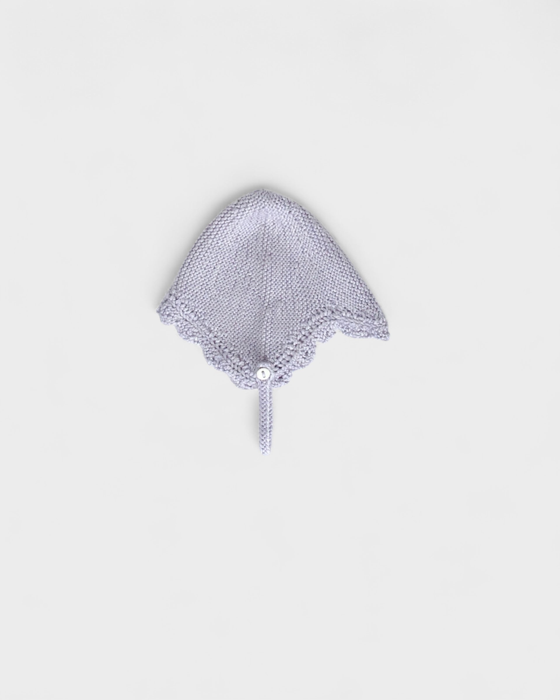 sweet knit cap with scalloped lace edging . chin strap with button closure