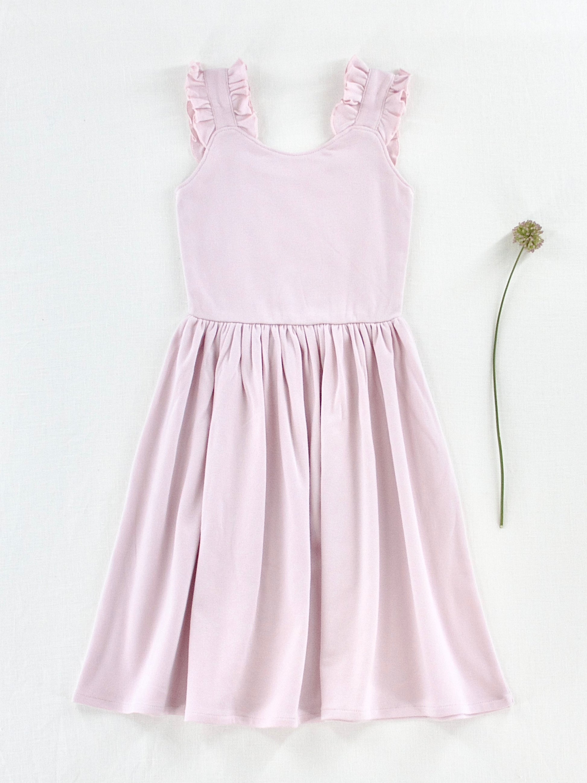 a perfect spring dress with ruffle strap detail . picot chain stitch edging detail . made from buttery soft pima cotton jersey