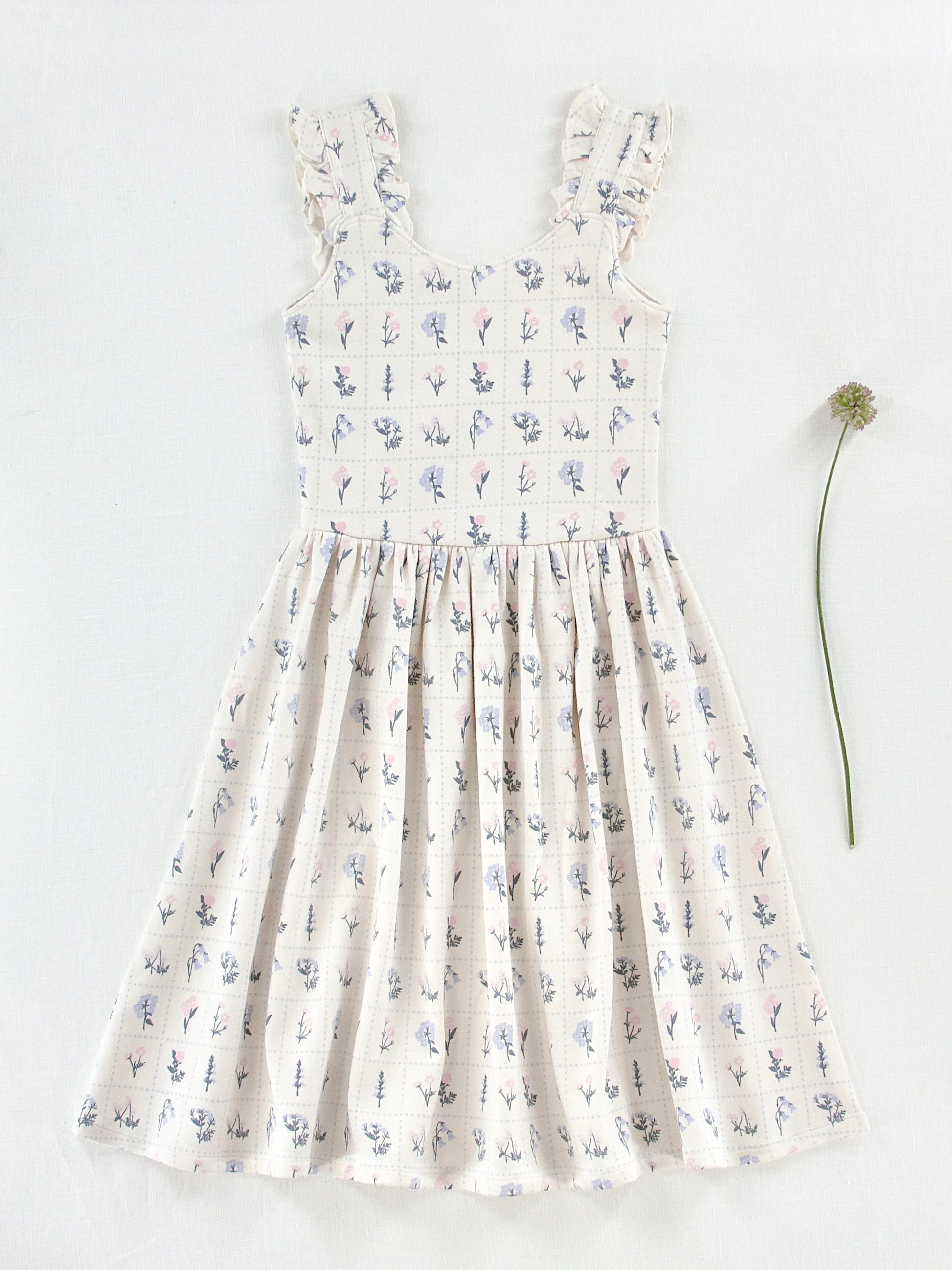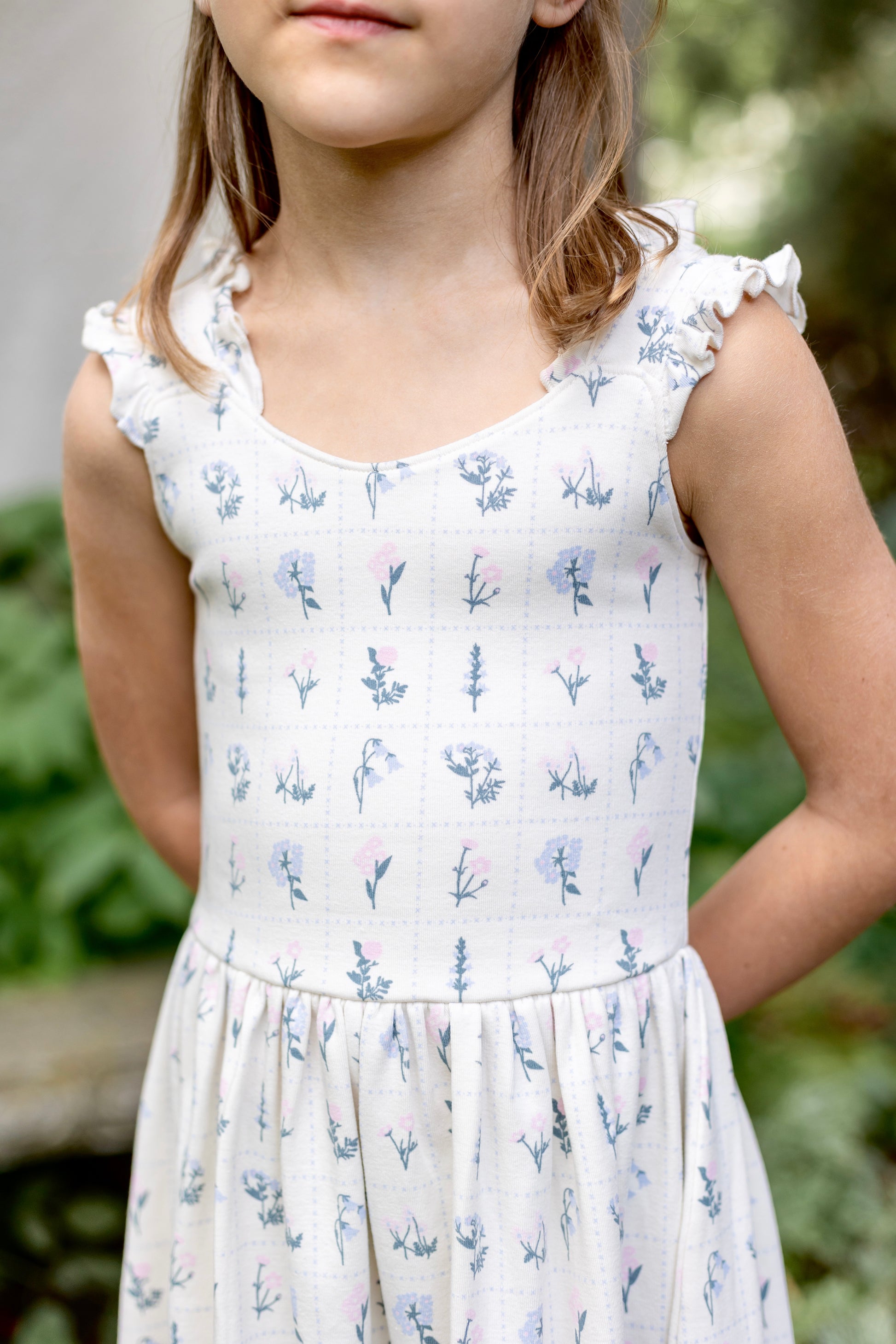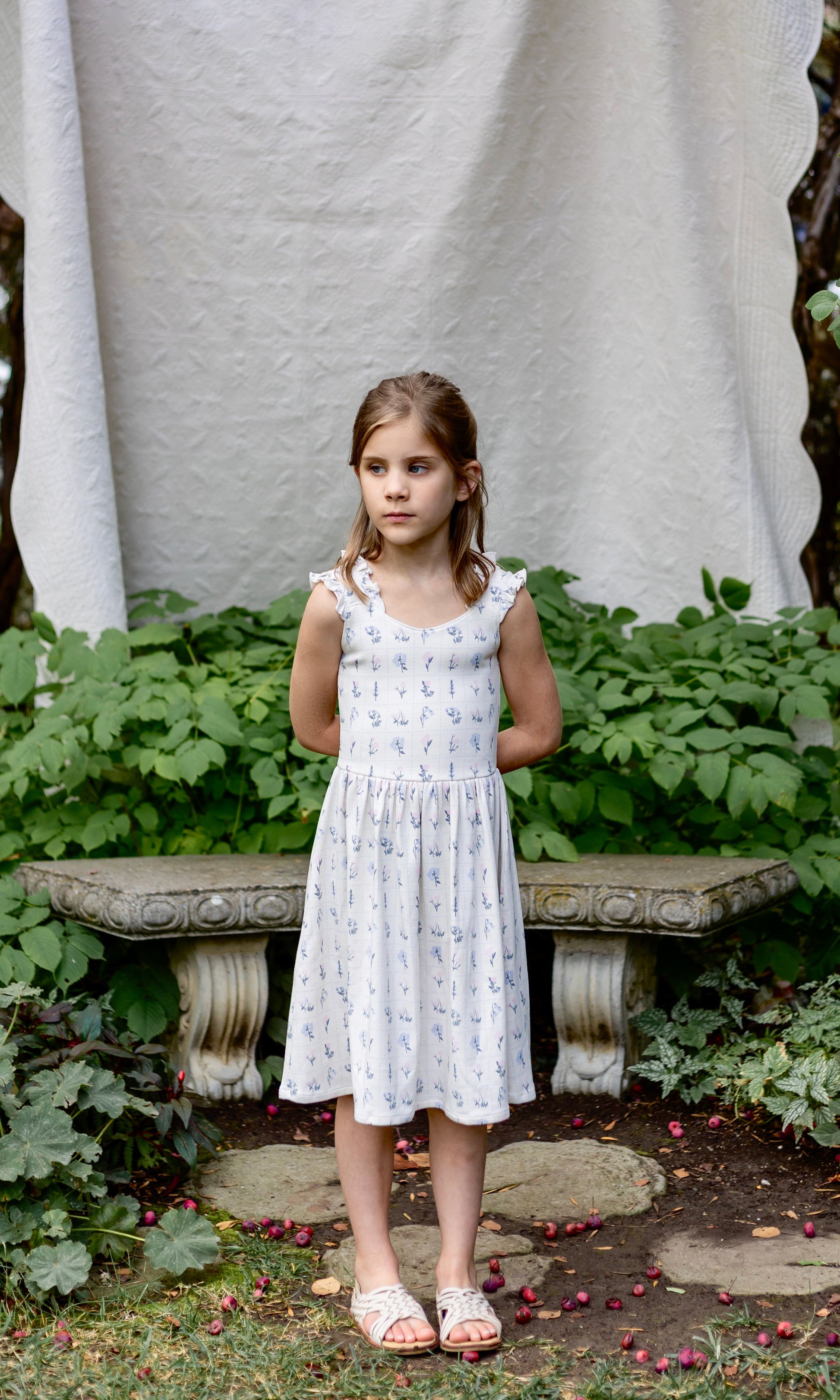 a perfect spring dress with ruffle strap detail. picot chain stitch edging detail. made from buttery soft pima cotton jersey