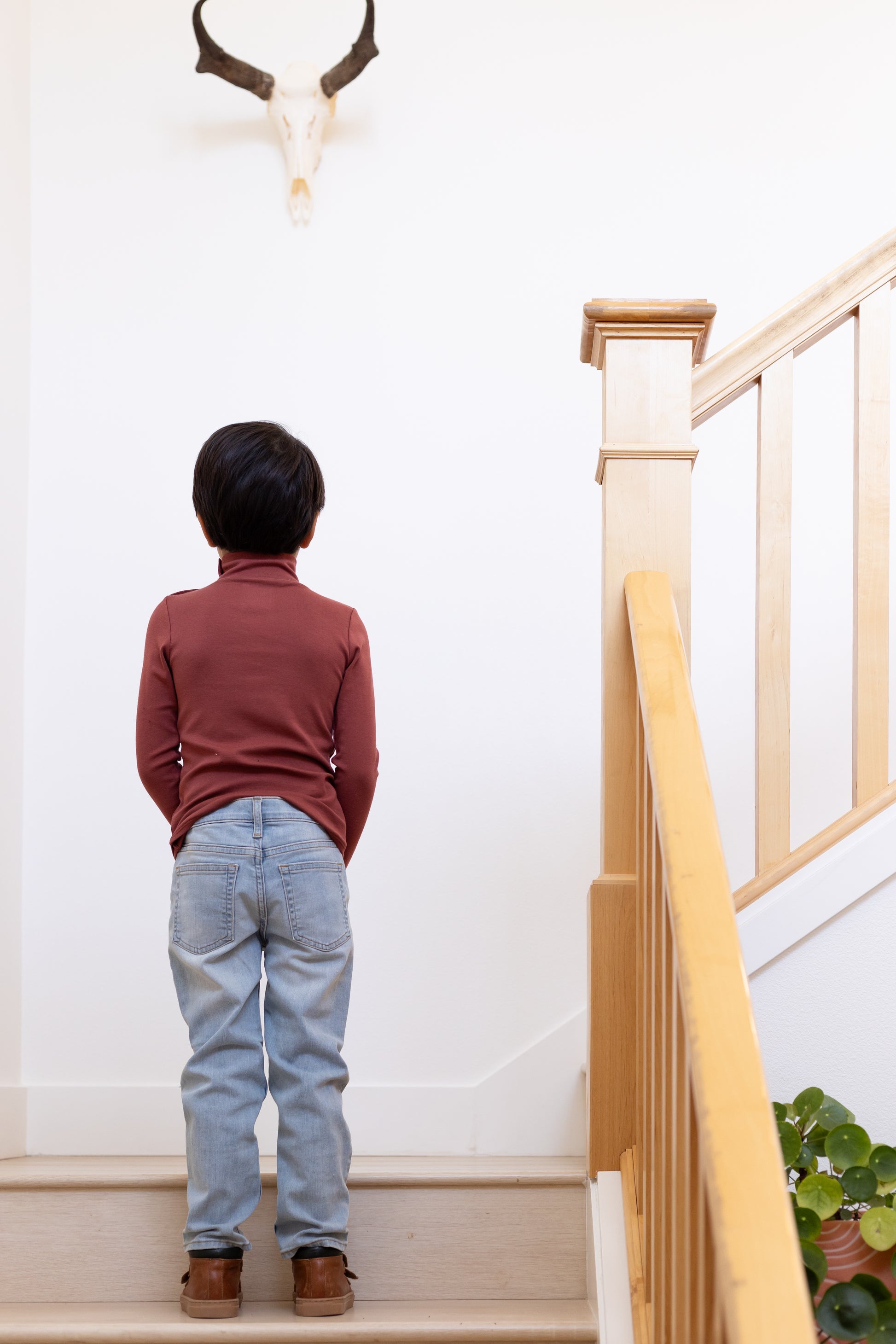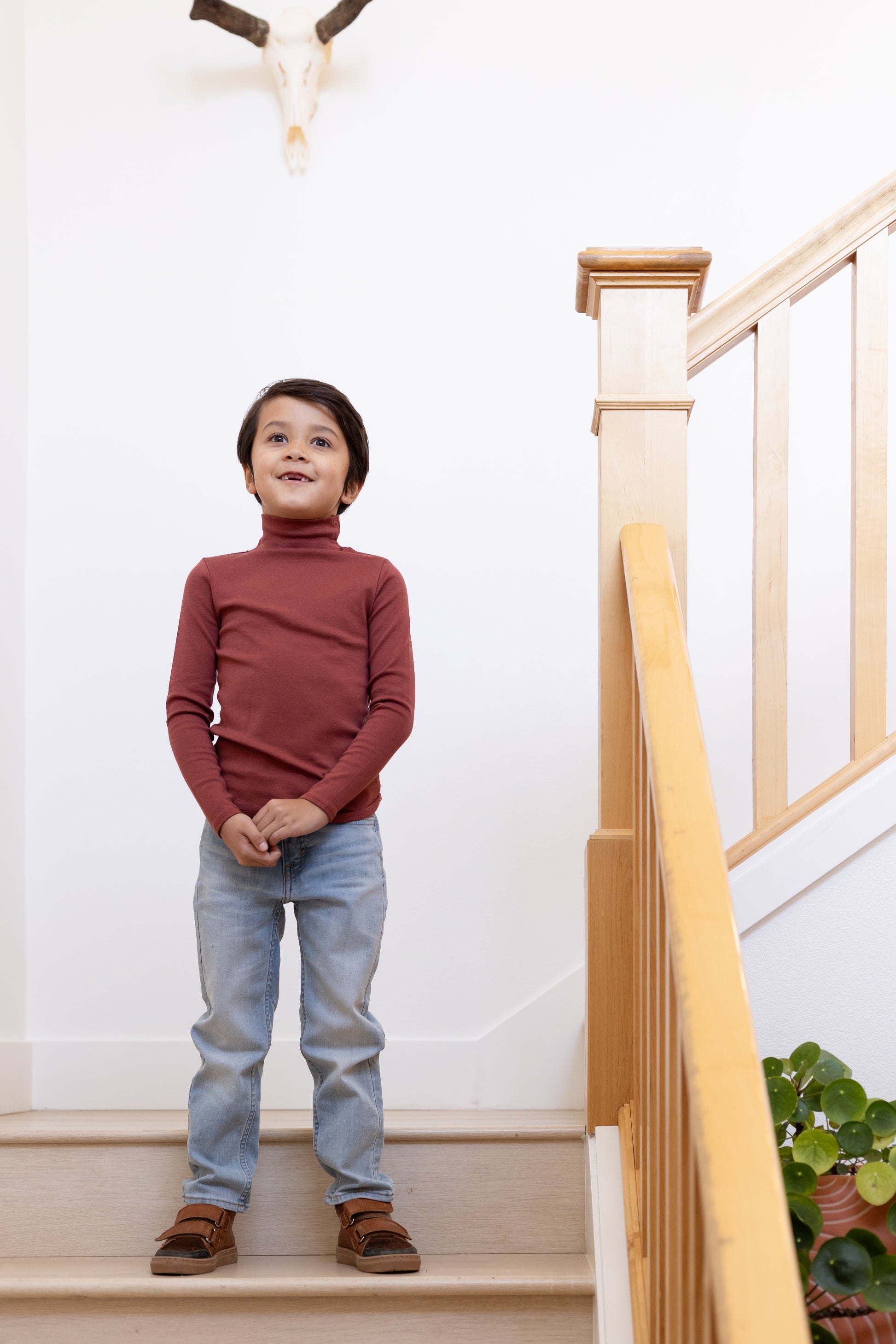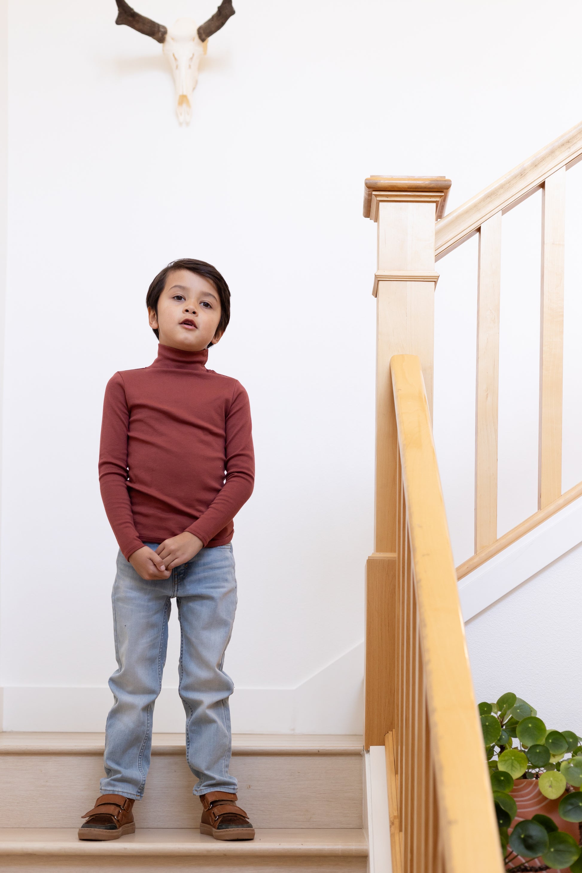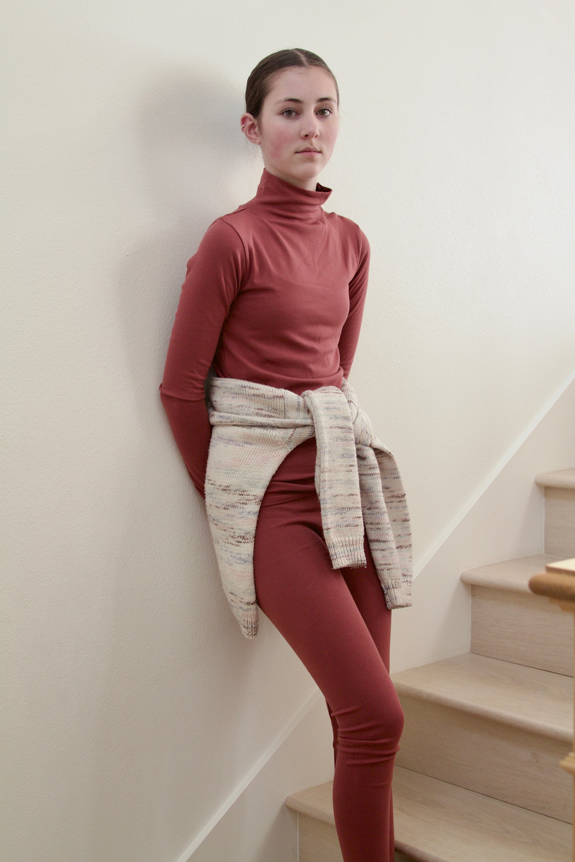 snap neck long sleeve turtleneck . made from buttery soft pima cotton jersey